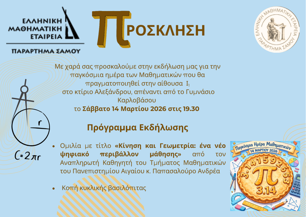 Το ερχόμενο Σάββατο, 14 Μαρτίου (3.14), γιορτάζουμε την Παγκόσμια Ημέρα Μαθηματικών με μια ξεχωριστή εκδήλωση του Παραρτήματος Σάμου της Ελληνικής Μαθηματικής Εταιρείας.